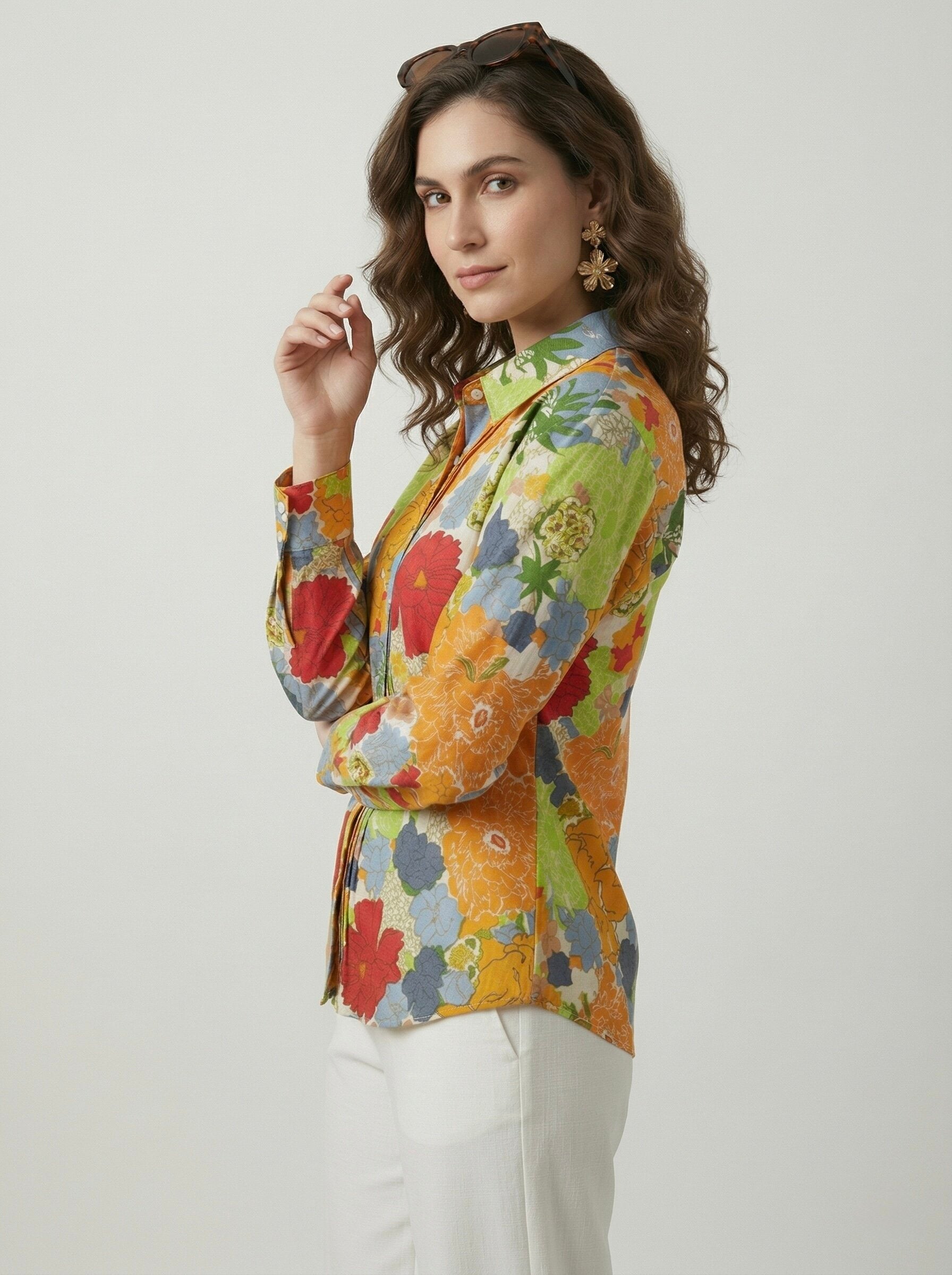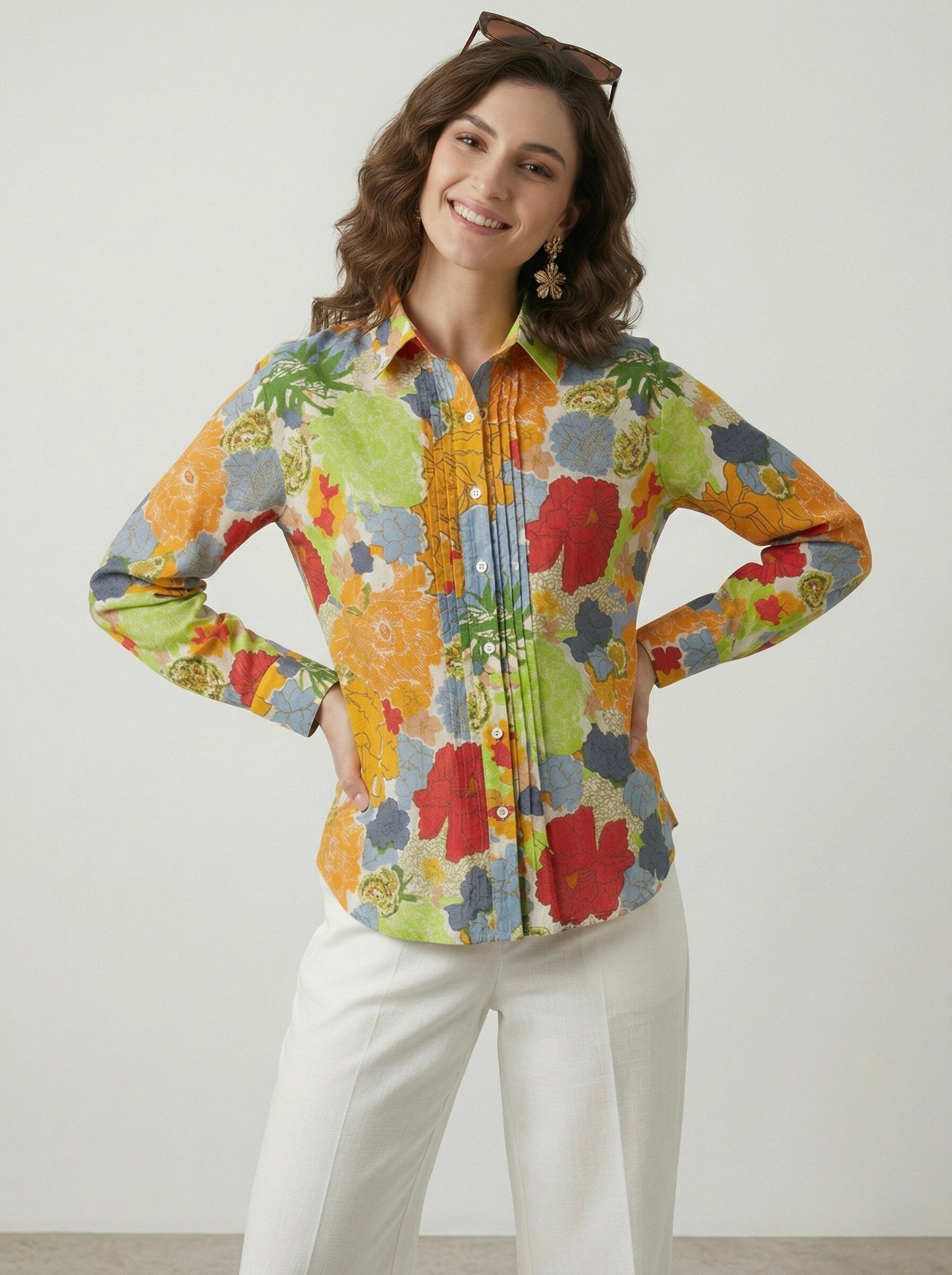 Women’s Multicolor Floral Shirt with Pintuck Detailing and 3/4th Sleeves