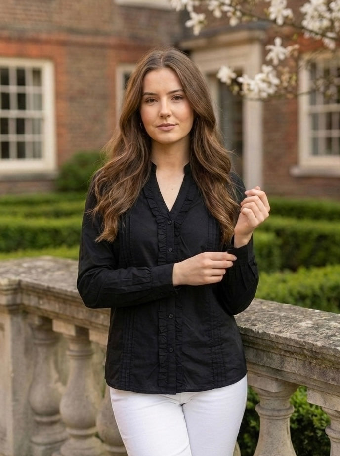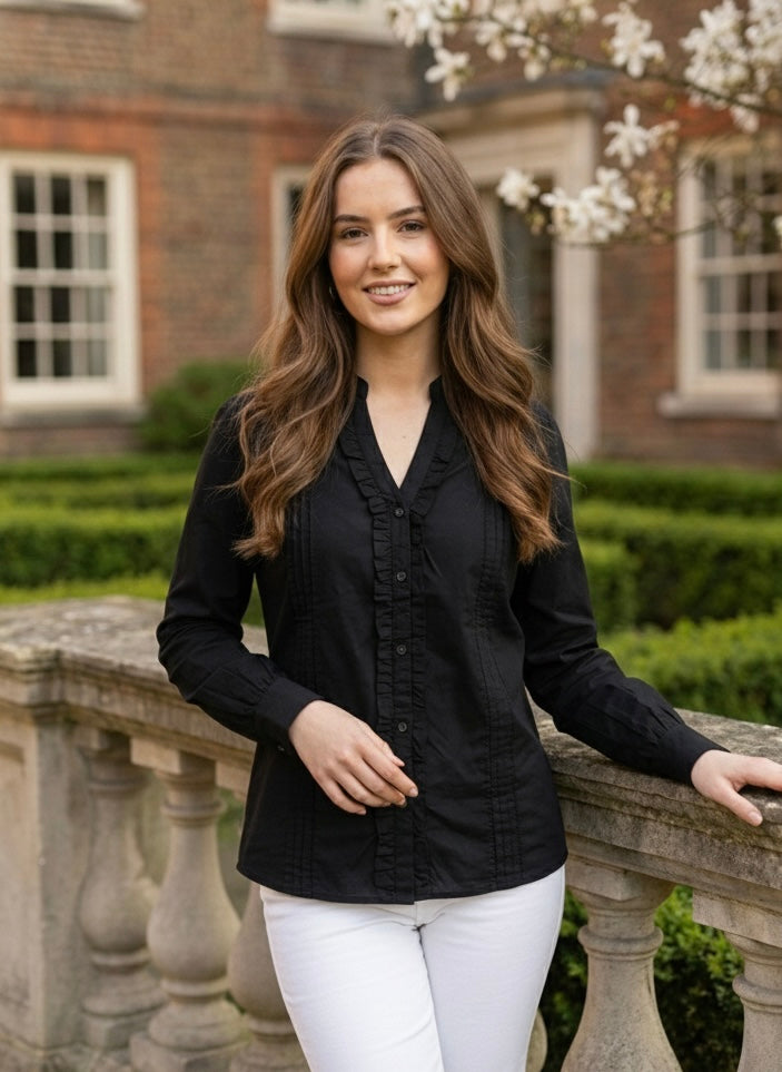 Women’s Classic Black Shirt with Pintuck Details & Ruffled Placket