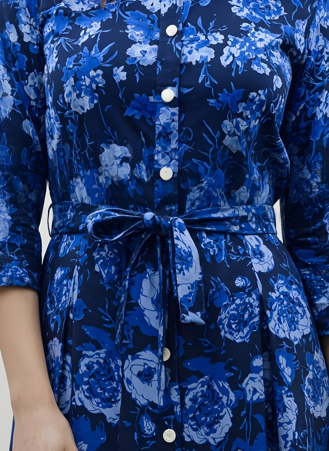 Midnight Bloom: Tie-Waist Blue Floral Shirt Dress