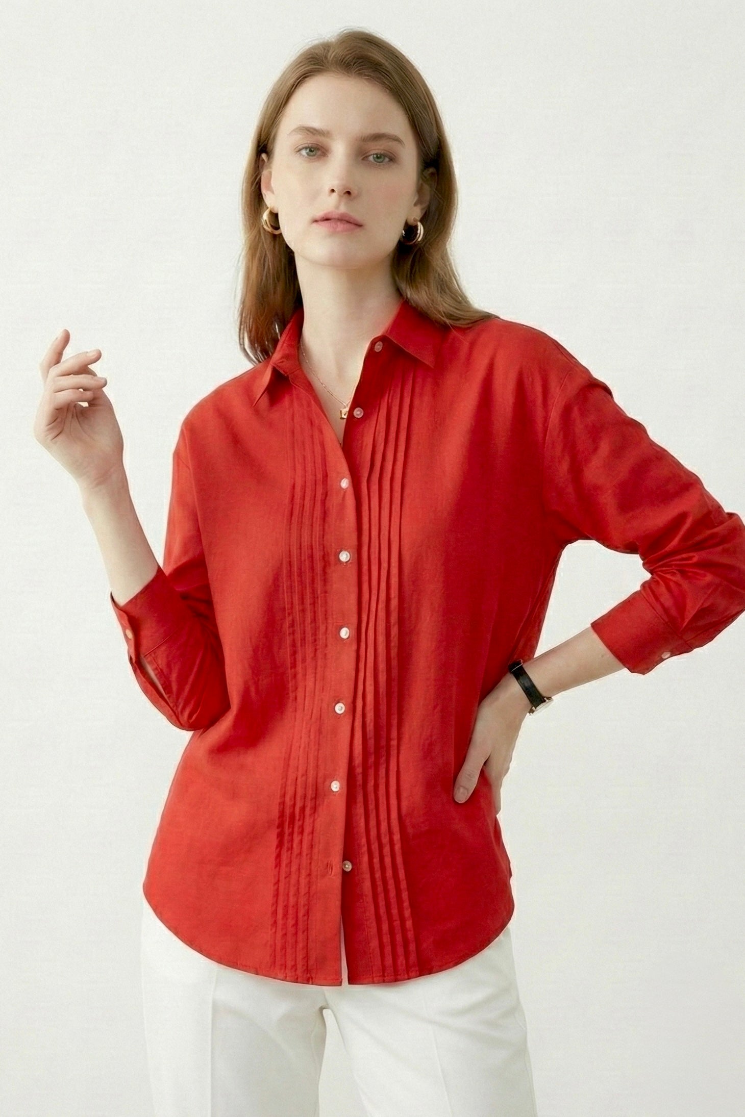 Crimson Poise: Solid Red Cotton Pintuck Shirt
