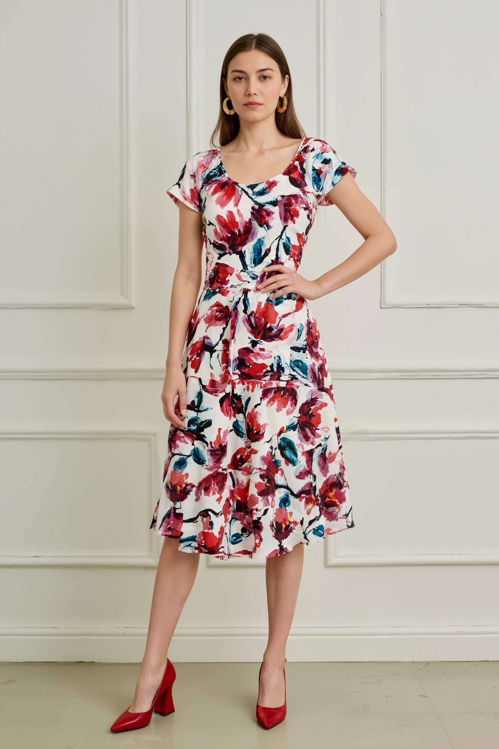 Women Classic Scoop Neck A-Line Midi Dress with Cap Sleeves.