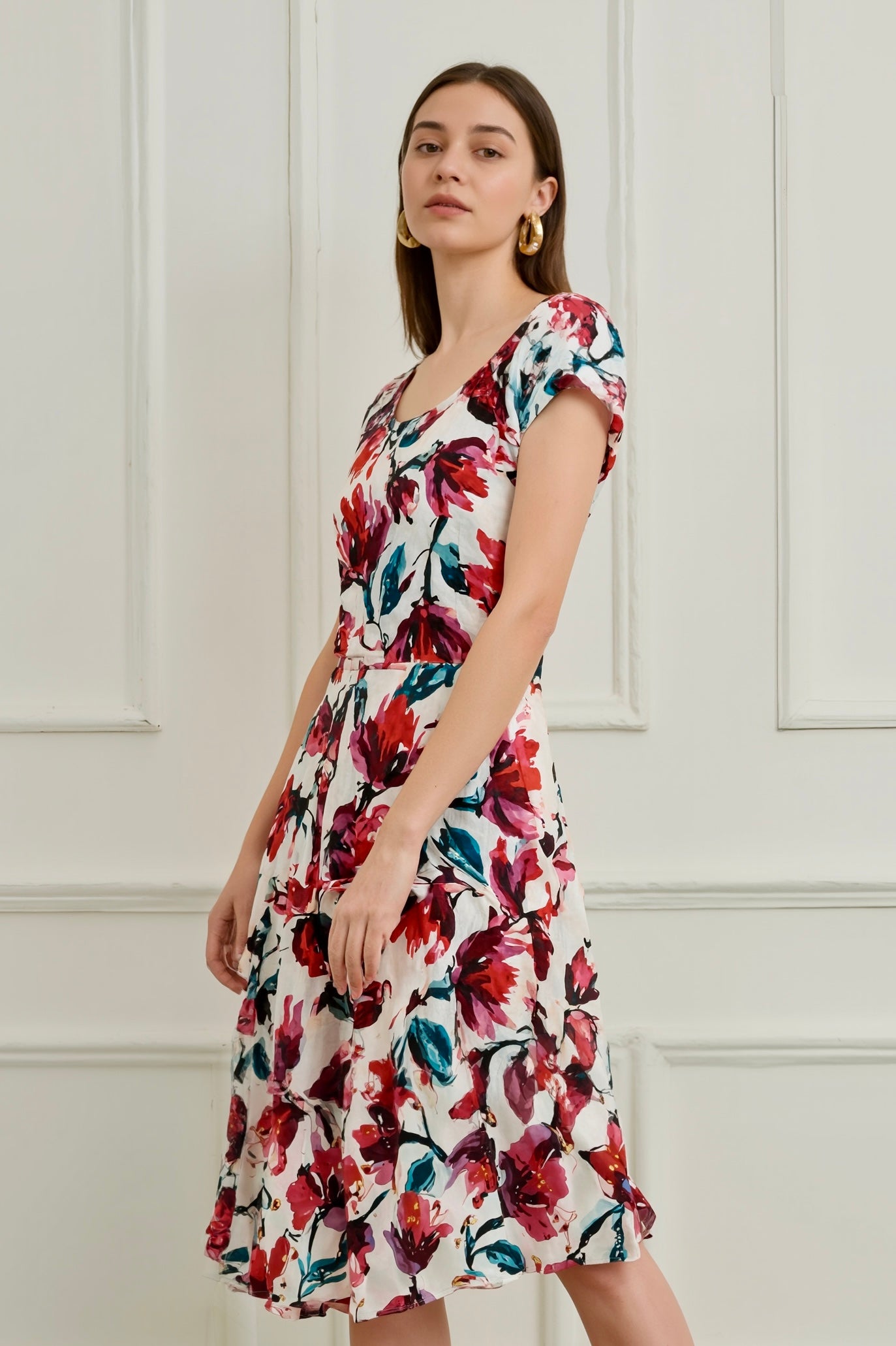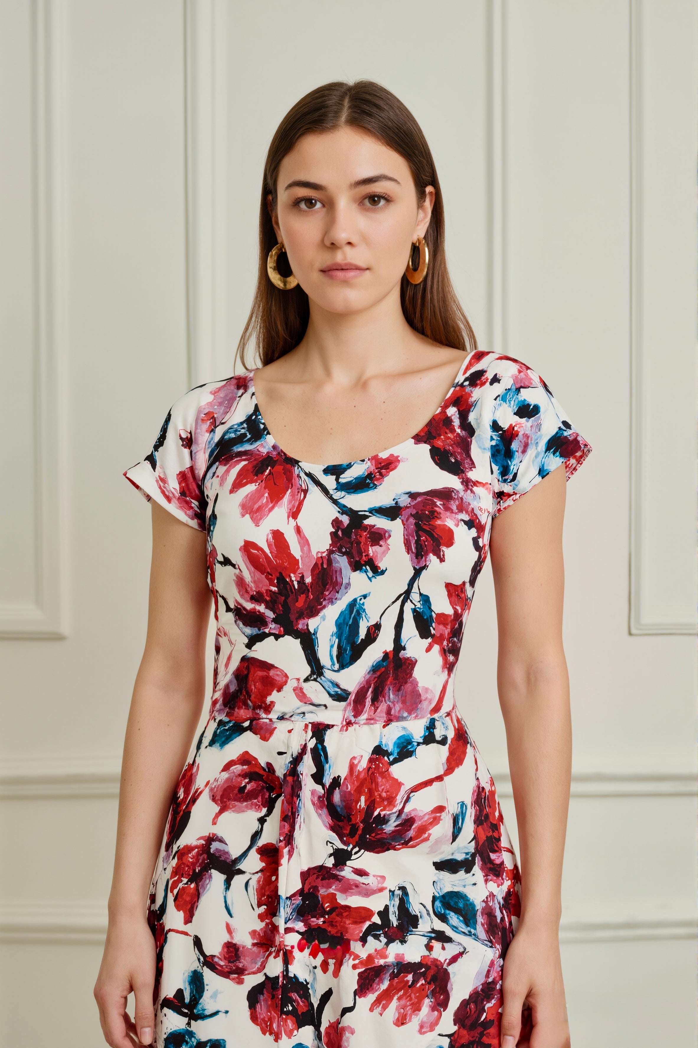 Featuring a vibrant print that celebrates vitality, this dress is your go-to for wherever life takes you—whether it’s a slow brunch, an impromptu work meet, or a well-deserved evening out. The soft scoop neckline and delicate cap sleeves frame your femininity with elegance, while the A-line silhouette flows freely, flattering every curve and every stride.
